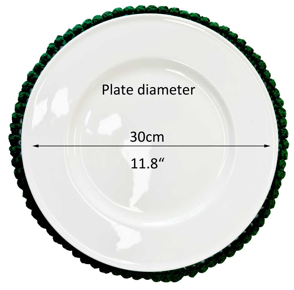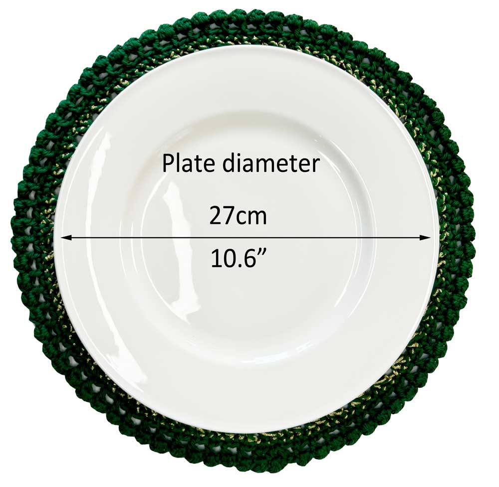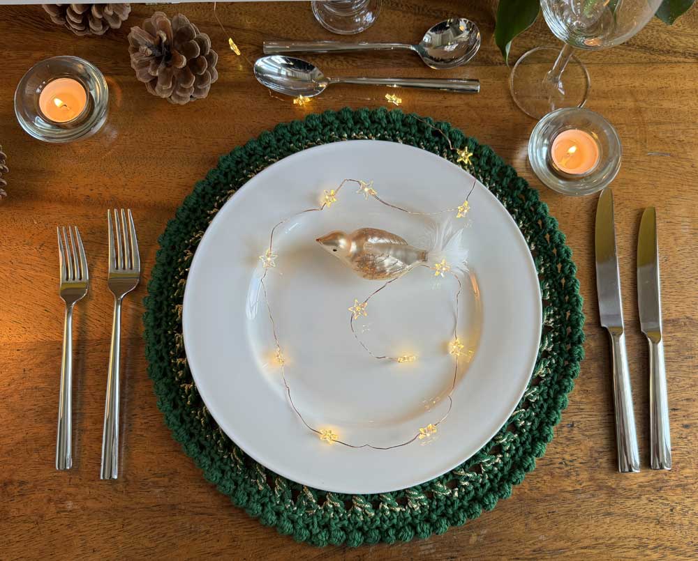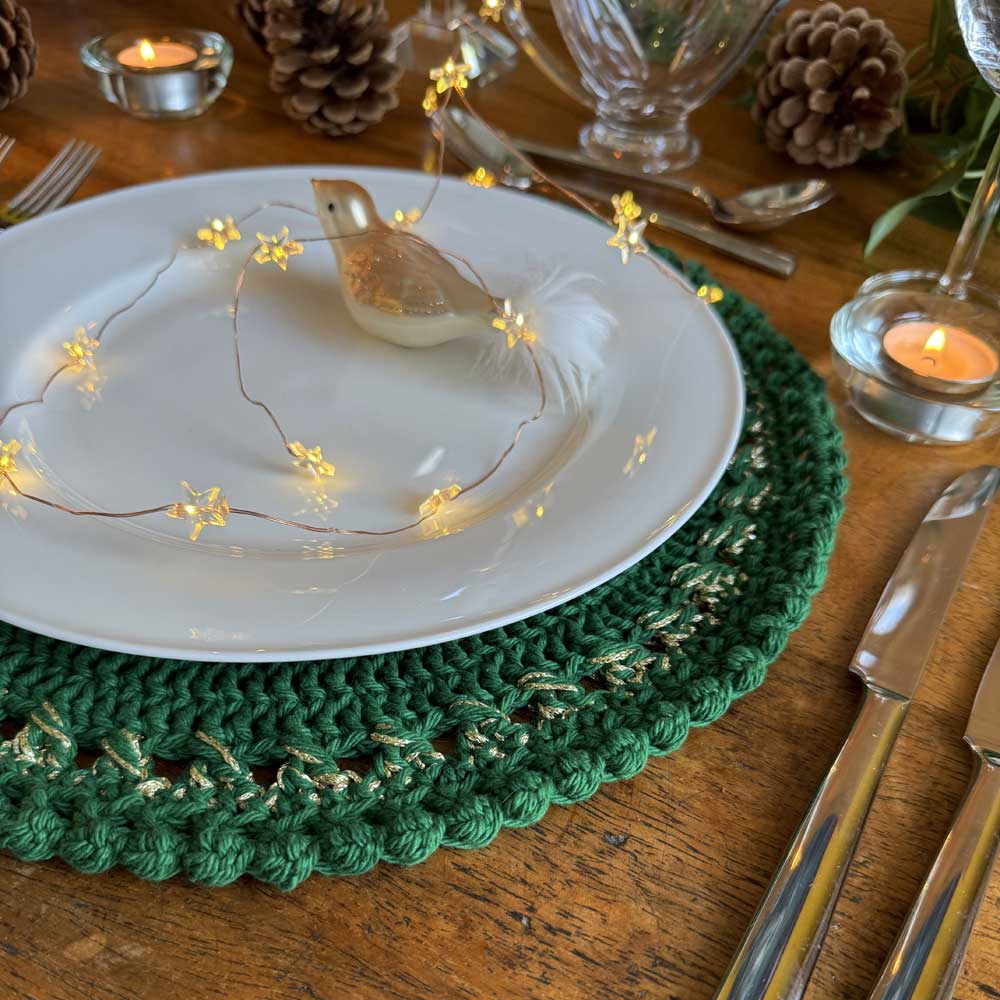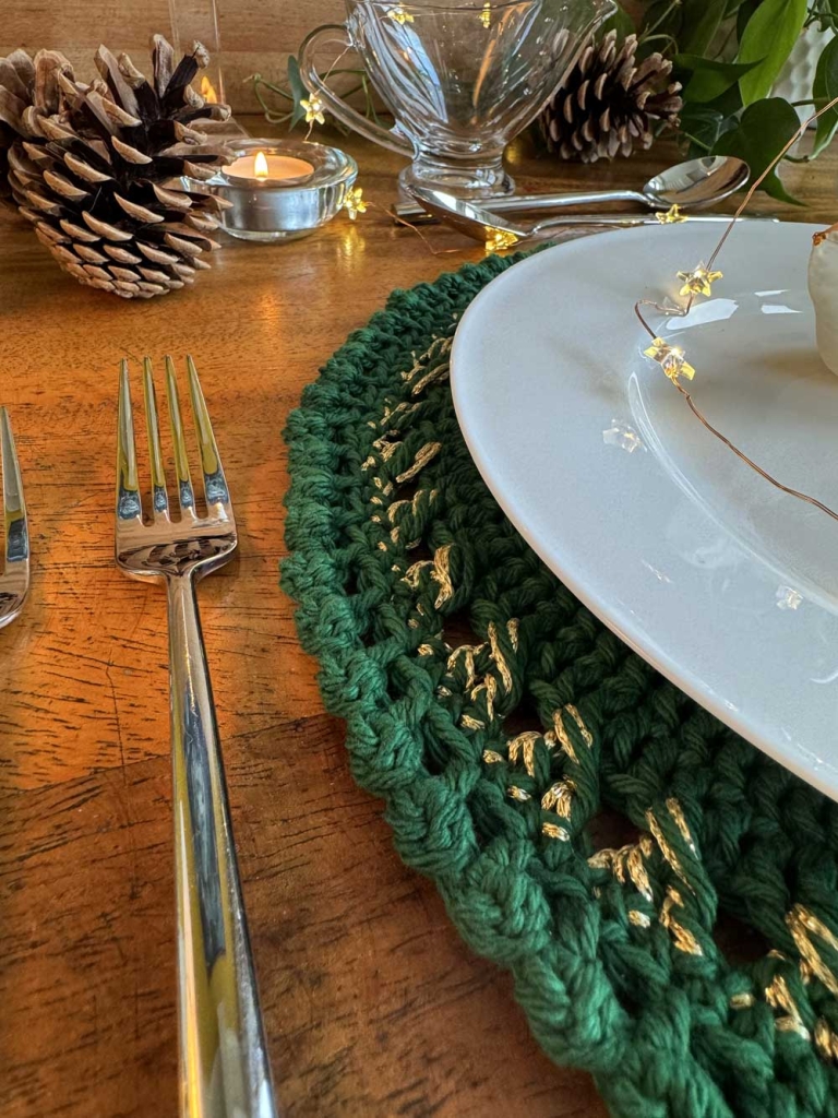 This is the first pattern I’ve written up into a pattern, despite wanting to create my own patterns for a long time. It was a moment of impulsiveness. I’d been looking for a pattern for my own Christmas table, and couldn’t find anything that was quite what I wanted. So I created my own: dark green with a touch of gold. I especially wanted a mat where decorative detail extended beyond the rim of the plate so it was a part of the tablescape. I achieved exactly what I set out to, and decided to write it up as a pattern. And here it is.