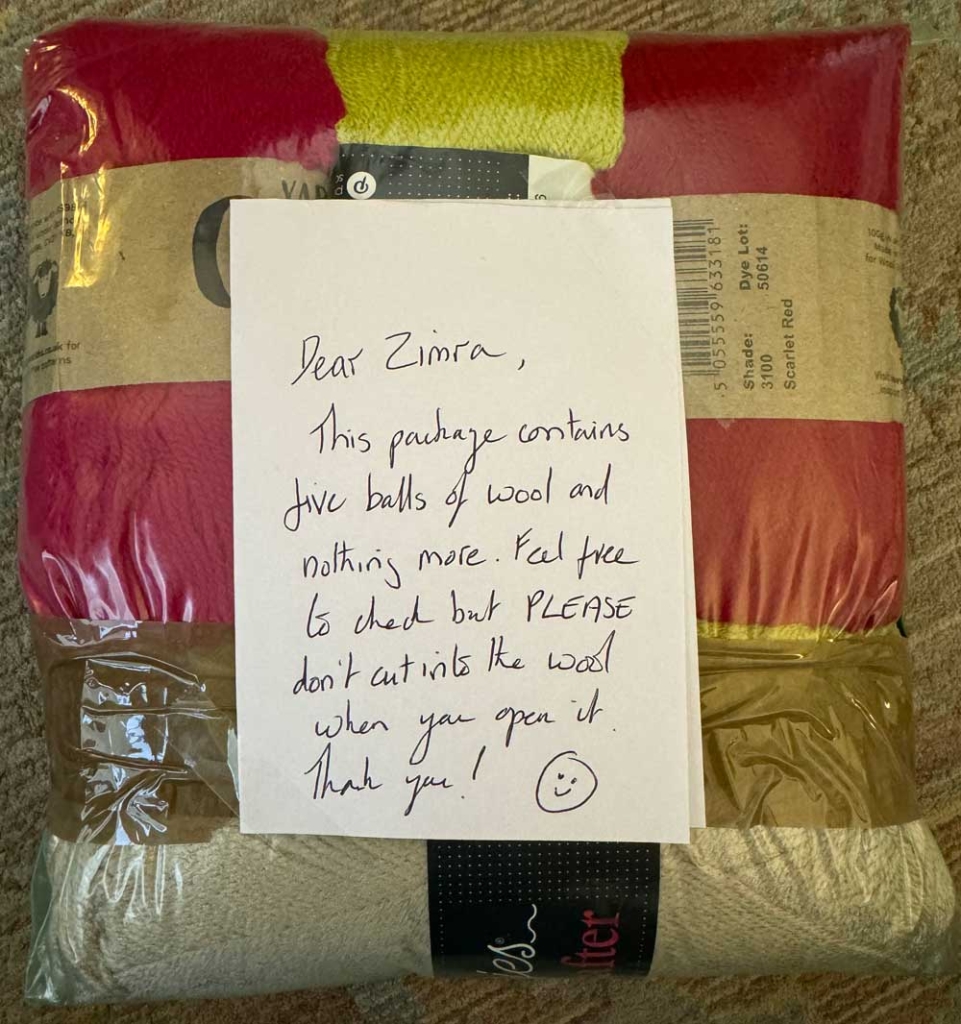 My part was over. My sister allowed some time to pass, then she visited our Runner’s shop in Zimbabwe, a small room in a private home stocked with ‘goodies’ that people can buy, all brought in by her from the UK. At Easter, she stocks Easter eggs, and I’ve seen Tesco’s mince pies at Christmas. She also has things like Branston’s pickle and underwear. The prices are UK retail prices, with an additional mark-up. Living here in the UK, as I do, I am absolutely stunned at what people will pay for, say, a packet of M&S Percy Pigs sweets. And behind the counter are all the parcels sent to Zimbabwe from the UK awaiting collection, including my sister’s yarn. The entire turn around time is a little over two weeks.
