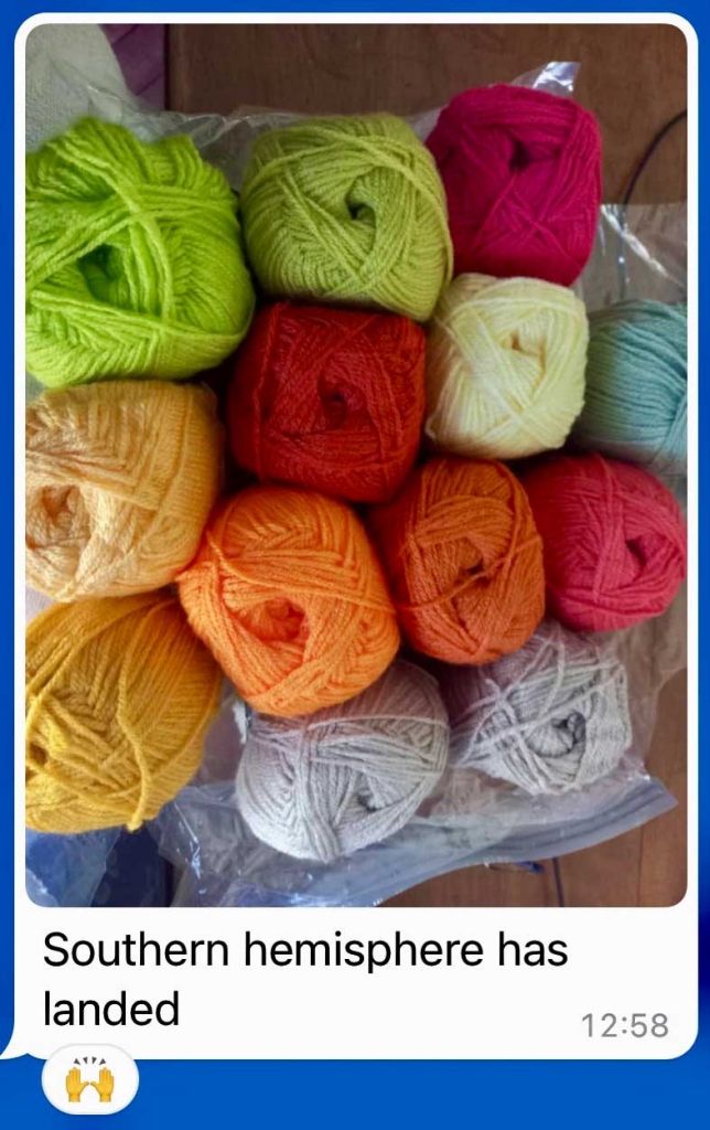 My sister finally had her yarn. She sent me a Whatsapp saying, ‘The southern hemisphere has landed’, accompanied by a photograph of the glorious little skeins now in Zimbabwe. It turns out that they arrived with the vacuum bag slit open, and as bulky fully inflated skeins, but nothing was missing.