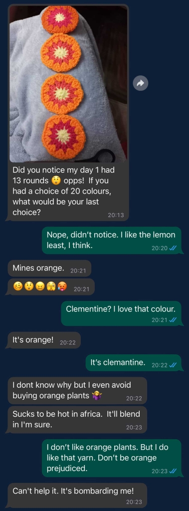 While she waits, my sister is doing what she can with the colours she already has. It’s hot, so there’s a lot of orange to crochet, she says (especially ‘Clementine’), and my sister doesn’t like orange. Well, that’s not my fault, Sissie. I blame the weather. Hopefully by the time the next parcel arrives the weather will have changed, and hopefully it’ll only require yarn colours that I’ve already sent! Next delivery will be in person, by me, when I visit.